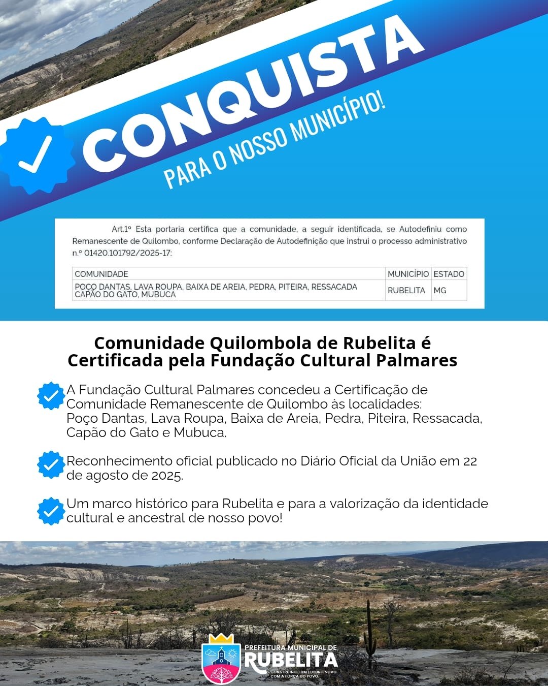 O município de Rubelita celebra uma importante conquista para sua história e identidade cultural. A Fundação Cultural Palmares concedeu a Certificação de Comunidade Remanescente de Quilombo às localidades de Poço Dantas, Lava Roupa, Baixa de Areia, Pedra, Piteira, Ressacada, Capão do Gato e Mubuca.